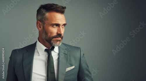 Forward-thinking man in his 40s with sleek hair in a gray suit