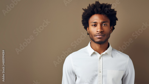 Confident Melanesian man in his 30s posing with a subtle smile in a studio