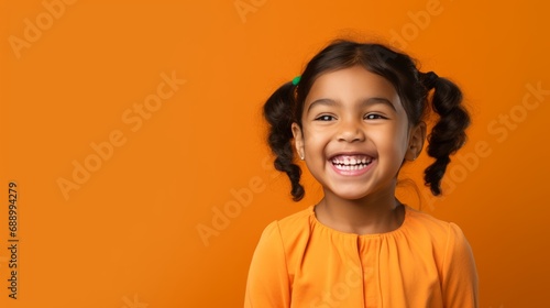Portrait of a confident woman with coiled hair in geometric dress against vibrant orange background expressing individuality and strength.