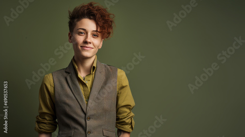 Confident young African American man in a stylish green suit gazing upward against a neutral background