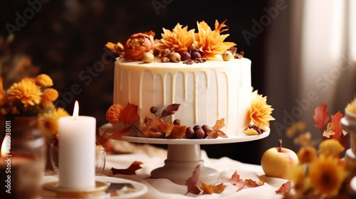 Handmade glazed cake on table for autumn-themed thanksgiving party