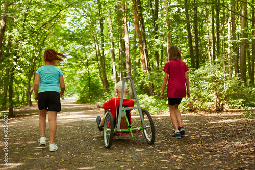 Girls walking with boy riding recumbent bike