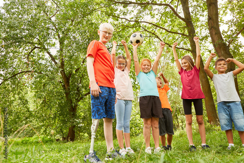 Handicapped boy walking with friends at park