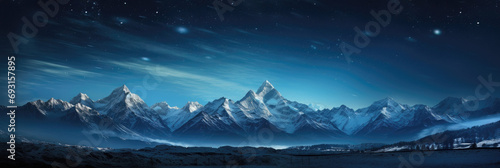 Starry night over peaceful snowy mountains and tranquil reflective lake