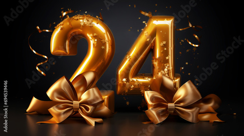 Celebratory scene of golden 2025 surrounded by colorful confetti and ribbons