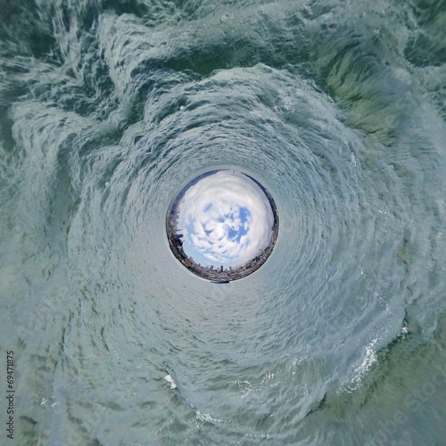 Satellite image of powerful hurricane over the ocean showing swirling clouds and eye of the storm