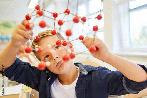 Boy holding molecular structure in elementary school