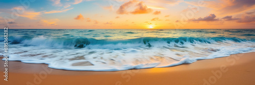 Marvellous sunrise at the beach, tranquil holiday destination with waves and golden sky