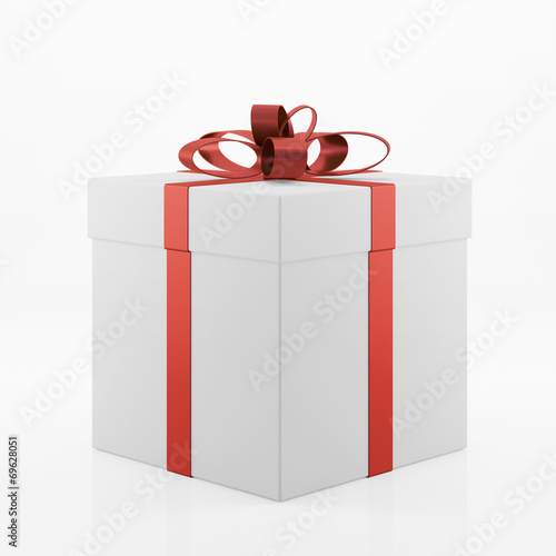 Elegant white gift box with red ribbon bow on a red background, perfect for gifts