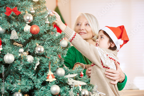 Kind mit Oma hängt Christbaumkugel an Weihnachtsbaum