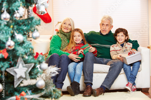 Großeltern mit Enkeln neben Weihnachtsbaum