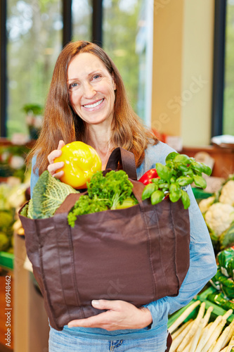 Frau mit Einkaufszettel kauft Gemüse im Bioladen