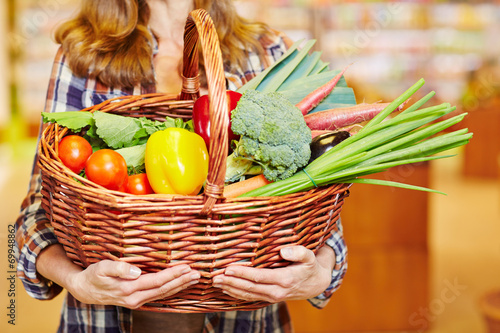 Frau zahlt mit Euroschein an Kasse im Supermarkt