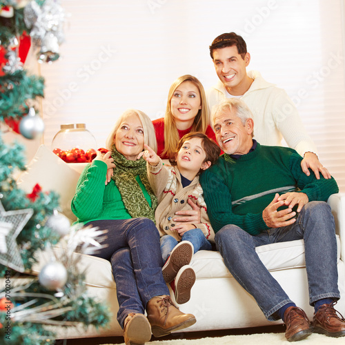 Großeltern mit Enkeln neben Weihnachtsbaum