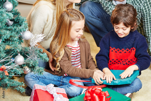Mädchen und Junge packen Geschenke aus zu Weihnachten