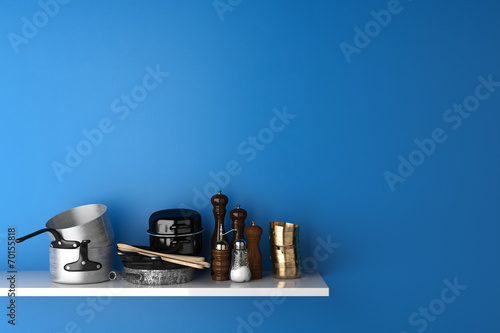 Regal an Wand in Küche mit Geschirr und Haushaltswaren