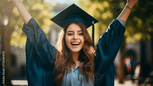 Smiling young woman with curly hair wearing a graduation cap outdoors
