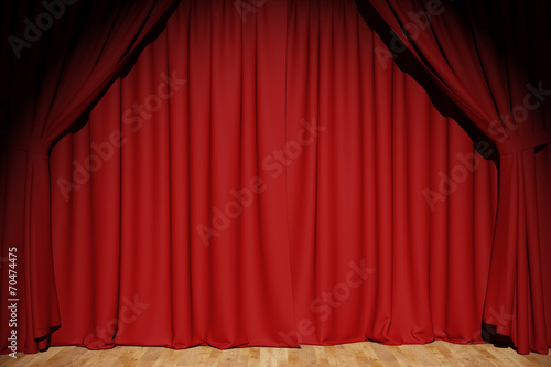 Festive 3D circus podium with red curtains and bright stage lights creating a dramatic show atmosphere