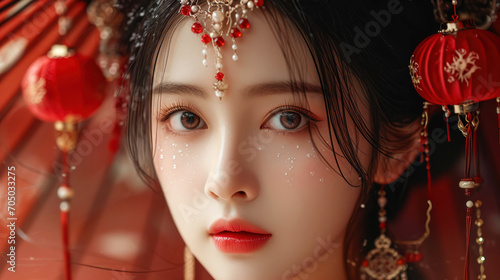 Portrait of beautiful young Chinese woman with traditional lanterns