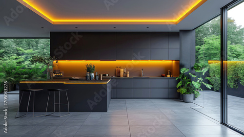 Modern open kitchen with dropped ceiling and LED strip lighting