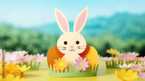 Playful Easter card with a 3D crafted bunny illustration and bright colors