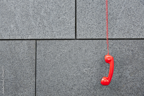 Red phone hanging down taped to a wall