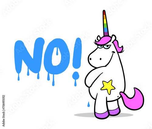 Freches Cartoon Einhorn pinkelt das Wort No!