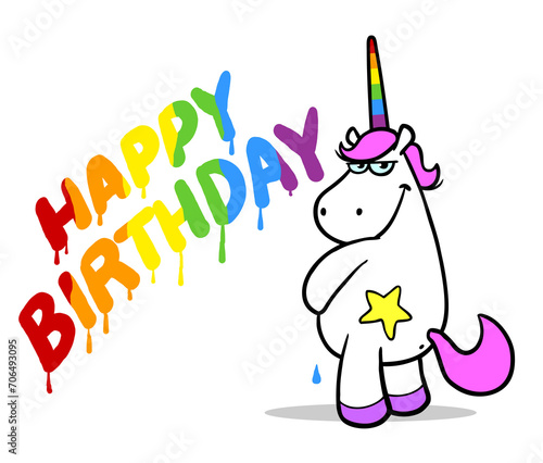 Rosa Einhorn wünscht Happy Birthday in Regenbogen Farben