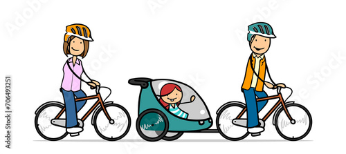 Familie beim Fahrrad fahren mit Kind im Anhänger