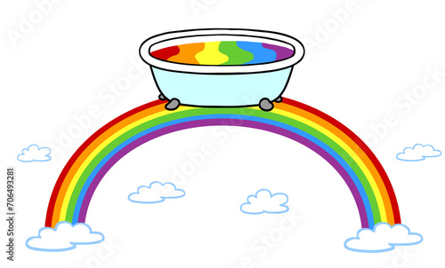 Colorful bathtub on a vibrant rainbow bridge with fluffy clouds in the background