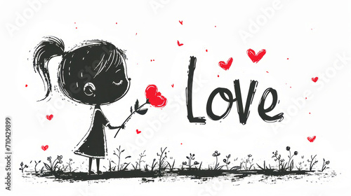 Doodle illustration of girl holding flower with Love text for Valentines Day