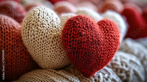 Red and white yarn knitted as hearts pattern as seamless texture background