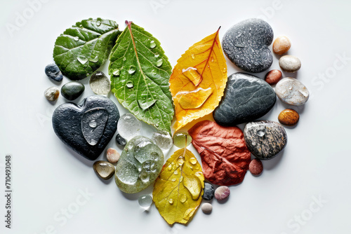 Love heart shape made of nature elements like stones and leaves for Valentines Day