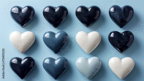 Modern shiny glossy love hearts arranged on blue background for Valentines Day