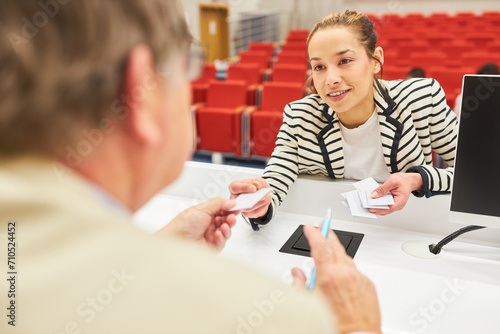 Businesswoman giving ID card to speaker at convention center