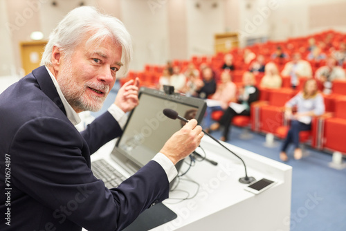 Professional answering during business conference in convention center