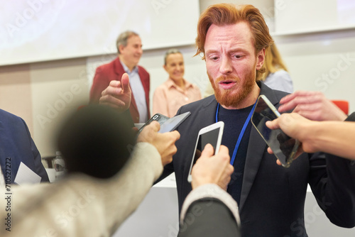 Speaker communicating journalists with phones at conference