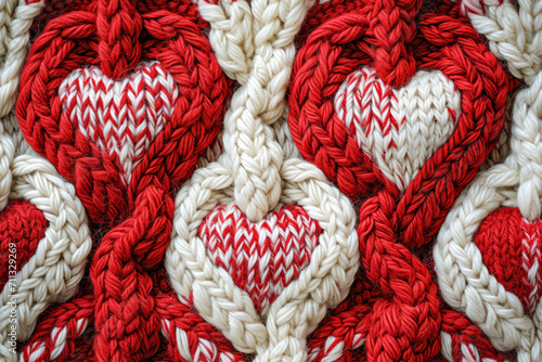 Red and white yarn knitted as hearts pattern as seamless texture background