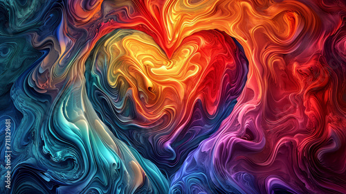 Swirling psychedelic patterns in love heart shape in vibrant rainbow colors