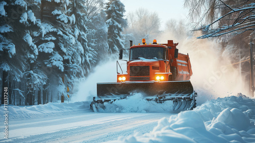 Snowplow cleaning snow from rural road in winter
