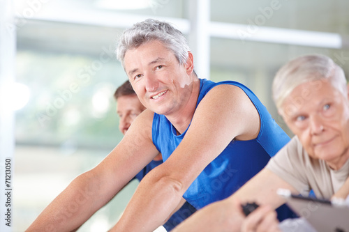 Älterer Mann trainiert auf Fahrrad im Fitnesscenter