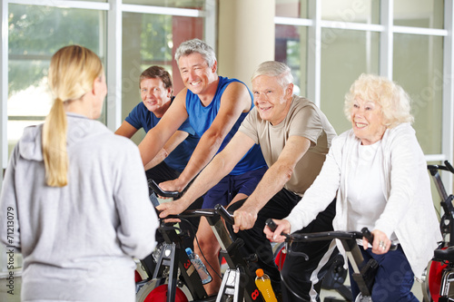Trainerin mit Stoppuhr zwischen Senioren beim Spinning