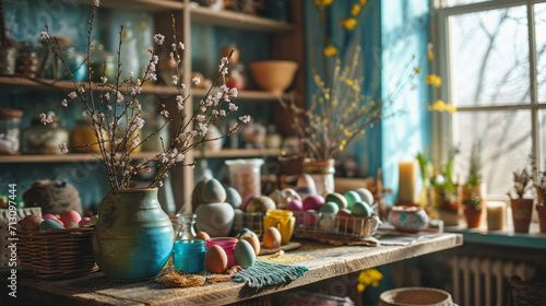 DIY Easter craft scene with materials for making decorations