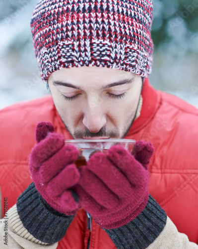 Mann im kalten Winter trinkt Tee