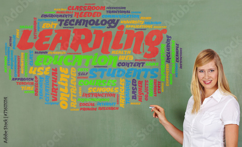 Frau mit Kreide an einer Tafel mit Konzept zu Bildung