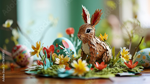 Playful Easter card with a 3D crafted bunny illustration and bright colors