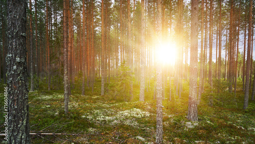 Forest in the morning with sun light through pine trees and sunflares