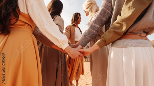 Multiethnic women in stylish clothes holding hands outside in the desert