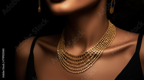 Cropped view of luxurious golden necklace on fashionable Black woman