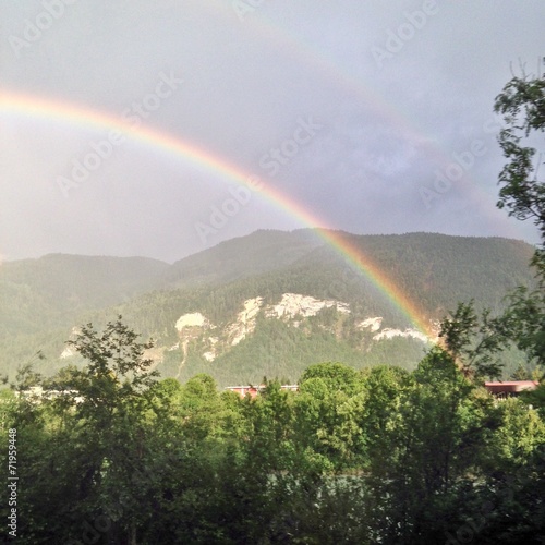 Panoramic view of a stunning rainbow over lush green hills after rain